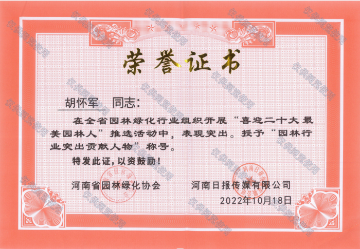 河南省園林綠化協(xié)會(huì)副會(huì)長(zhǎng)、省園林養(yǎng)護(hù)管理專(zhuān)業(yè)委員會(huì)會(huì)長(zhǎng)、河南江海園林綠化產(chǎn)業(yè)有限責(zé)任公司董事長(zhǎng)胡懷軍在全省園林綠化行業(yè)組織開(kāi)展“喜迎二十大最美園林人”推選活動(dòng)中,表現(xiàn)突出,榮獲“園林行業(yè)突出貢獻(xiàn)人物”稱(chēng)號(hào)。此次“喜迎二十大最美園林人”活動(dòng)以踐行習(xí)近平總書(shū)記新時(shí)代生態(tài)文明建設(shè)思想總體部署,堅(jiān)持以人為本、生態(tài)優(yōu)先、綠化發(fā)展理念,進(jìn)一步彰顯河南園林綠化從業(yè)人員的新氣象、新風(fēng)尚營(yíng)造“發(fā)現(xiàn)先進(jìn),學(xué)習(xí)先進(jìn),爭(zhēng)當(dāng)先進(jìn)”的濃厚氛圍,充分激發(fā)和調(diào)動(dòng)全省園林人建設(shè)綠色之城、花園之城、生態(tài)之城的主動(dòng)性、積極性和創(chuàng)造性,著力凝聚奮發(fā)進(jìn)取,崇德向上的精神力量,共建共享生態(tài)宜居美麗河南。