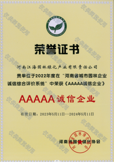 河南江海園林綠化產(chǎn)業(yè)有限責(zé)任公司再次榮獲2022年度“河南省城市園林企業(yè)誠(chéng)信綜合評(píng)價(jià)系統(tǒng)AAAAA誠(chéng)信企業(yè)”。企業(yè)的誠(chéng)信度不斷增強(qiáng),工程質(zhì)量不斷提高。誠(chéng)信企業(yè)的榮譽(yù)強(qiáng)化了企業(yè)的法律意識(shí)和責(zé)任意識(shí),規(guī)范企業(yè)經(jīng)營(yíng)行為、誠(chéng)信經(jīng)營(yíng),引導(dǎo)企業(yè)在市場(chǎng)經(jīng)營(yíng)中良性競(jìng)爭(zhēng),共同可持續(xù)發(fā)展,有效的促進(jìn)了企業(yè)誠(chéng)信經(jīng)營(yíng)的力度,優(yōu)質(zhì)工程越發(fā)增多。